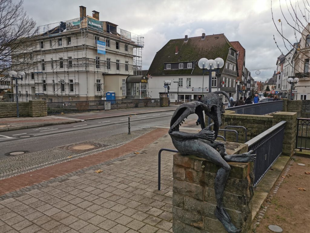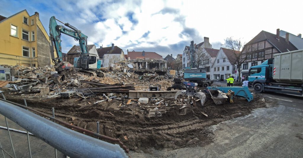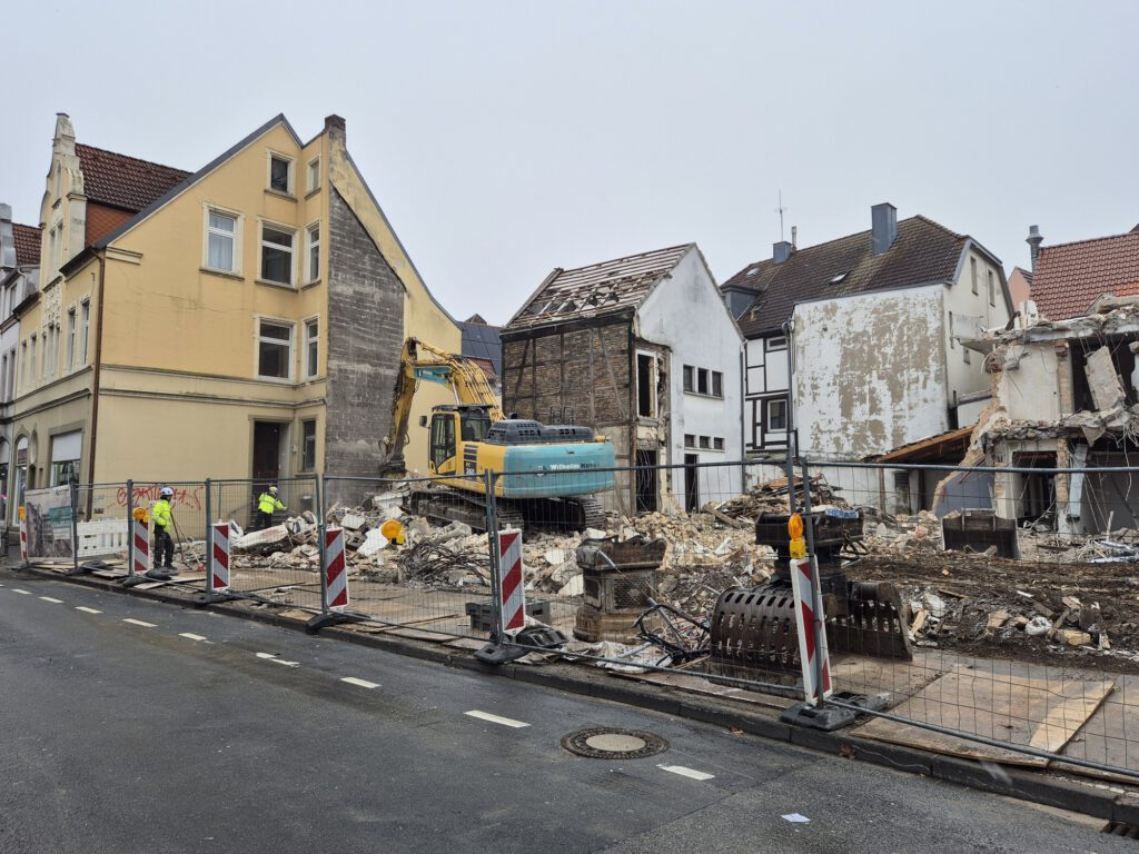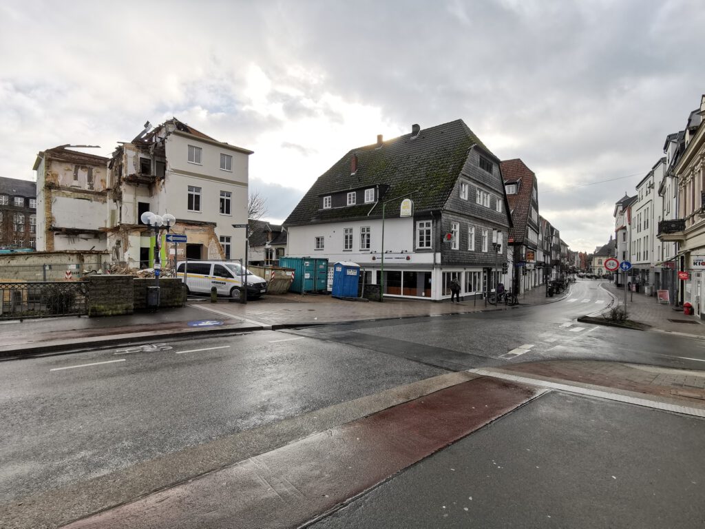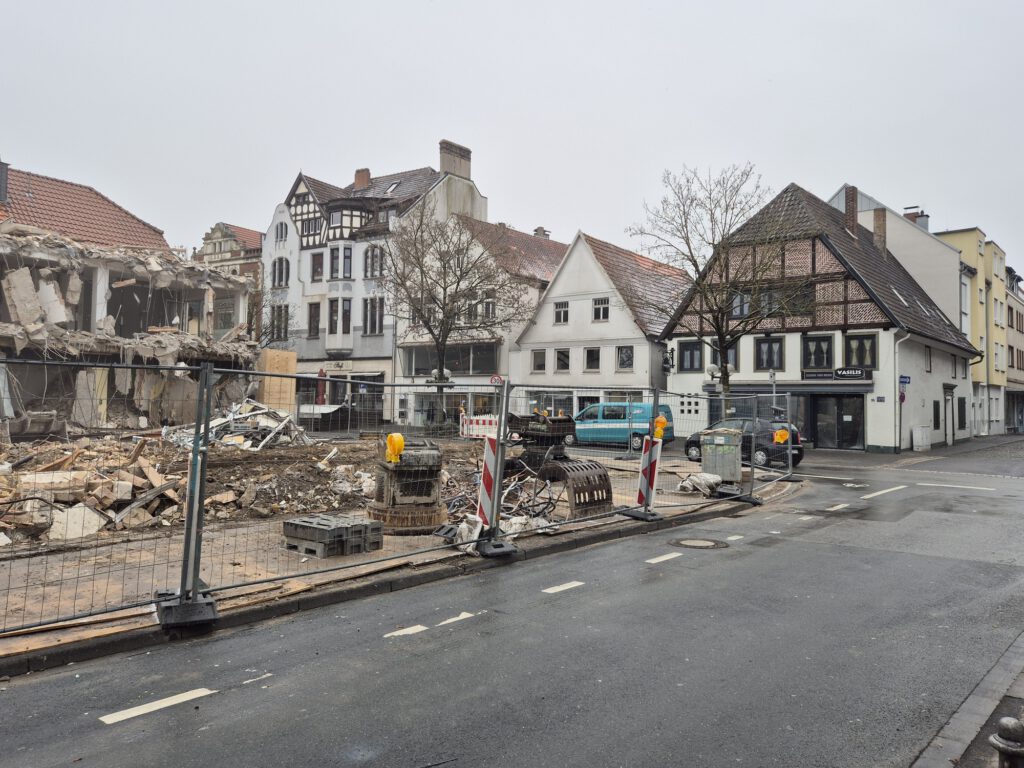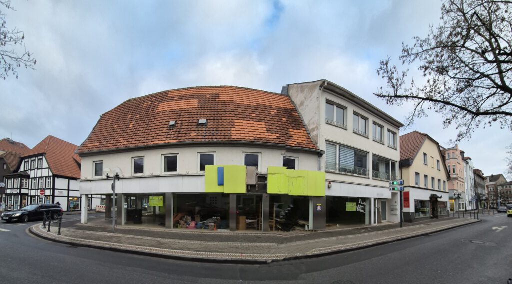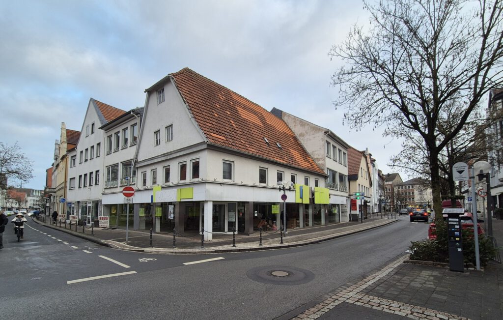 Aus der Historie weiß man, dass der abgewalmte Giebel des Hauses an der Ecke einmal mit Lüftel-Malerei verziert war und einen Möbelladen beinhaltete. Zuletzt war hier der Fahrradladen Schulte-Hostede beheimatet, der auch im Neubau einen Platz finden wird.