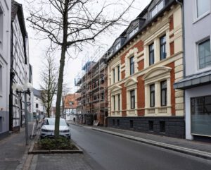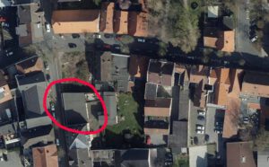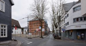 In direkter Nachbarschaft – rechts am Bildrand -stand ein eingeschossiges Gebäude, damals mit einem Modeladen. Dieses Grundstück ist nun jüngst bebaut worden in Angleichung an die angrenzenden hohen Gebäude. Das Grundstück ist im Luftbild rot eingekreist (Quelle: Geoserver Stadt Lippstadt)