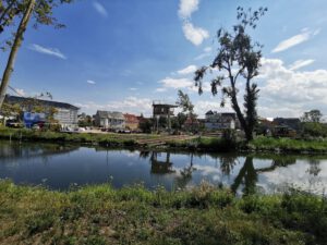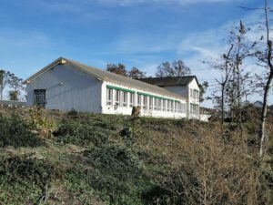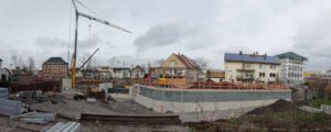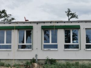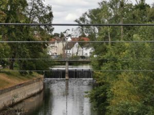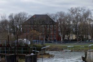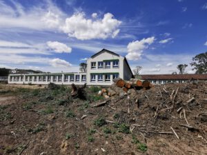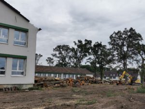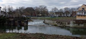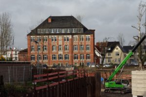 Oben sieht man noch zu Beginn der Bauarbeiten am Wehr die Ansicht der Schule mit dem hohen Baumbestand.