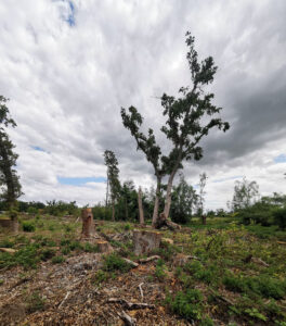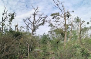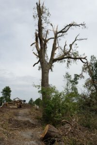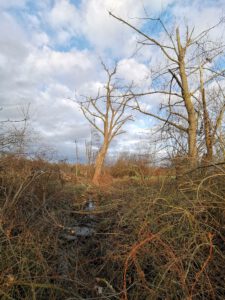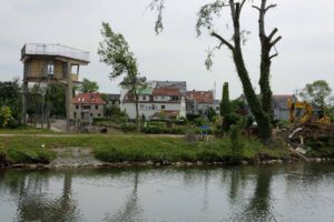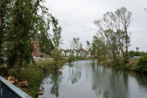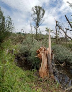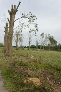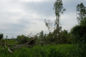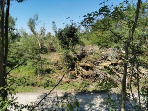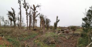 Vor dem Tornado waren hier die Südflanke der Kleingartenanlage und der Verlauf der alten Lippeschleife mit hohem Baumbestand landschaftsprägend. Heute ist der Wald an diesen Orten schwer geschädigt.