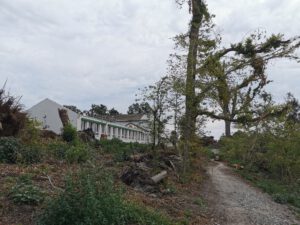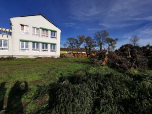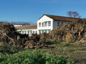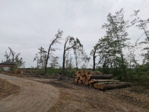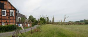 In der Bildergalerie sind zunächst zwei Googl-Luftbilder zu sehen. Auf dem ersten Bild sieht man in der Bildmitte die Alleereihe an der nördlichen Seite der Straße, die weitgehend vernichtet wurde. Auf dem zweiten Bild ist nördlich des alten Pastorats ein kleiner Wald zu sehen, der ebenfalls dem Sturm zum Opfer fiel.