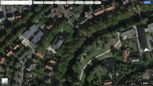Auf dem Luftbild (Quelle: Google) ist der Zustand der Landschaft vor dem Tornado zu sehen. Am südlichen Waldrand oben ist die Kleingartenanlage eingebettet in eine Lichtung des Waldes. Der gesamte Baumbestand an der südöstlichen Flanke der Anlage wurde vernichtet, ebenso wie die Baumreihen entlang der Lippe und die Abschirmung der Industrieanlagen des Werkes Thyssenkrupp Rothe Erde nach Süden hin (oben rechts im Bild). Die Schrebergärtner sind insgesamt noch mit einem „blauen Auge“ davongekommen, denn die großen Eichen im Norden fielen zum Teil nach Norden und so wurden nur relativ wenige Gebäude in Mitleidenschaft gezogen.