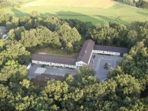 Im Luftbild sieht man hier die Waldstücke beidseitig der Udener Straße, das evangelische Gymnasium und die neue Sporthalle südlich davon.